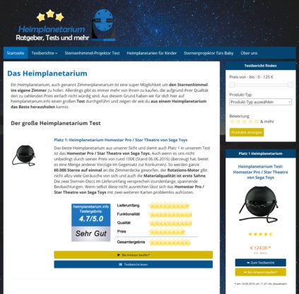 Das beste Heimplanetarium aus unserer Sicht und damit auch Platz 1 in unserem Test ist das Homestar Pro / Star Theatre von Sega Toys. Auch wenn es uns nicht unbedingt durch seinen Preis von rund 100€ (Stand 06.06.2016) überzeugt hat, bietet es eine Menge anderer Vorzüge im Gegensatz zur Konkurrenz. So werden ganze 60.000 Sterne auf einmal an die Zimmerdecke geworfen, der Rotations-Motor gibt nicht allzu viele Geräusche von sich und auch die Materialqualität ist erste Sahne. Die zwei Sternen-Discs im Lieferumfang versprechen stundenlange, spannende Beobachtungen. Wenn selbst diese nicht ausreichen lässt sich das Homestar Pro / Star Theatre von Sega Toys mit zwei weiteren Karten problemlos aufrüsten.